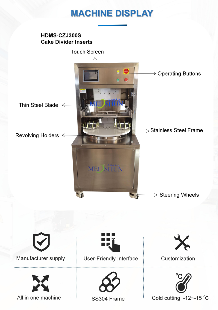 Ultrasonic cake divider inserts are designed for round cakes. They are automatic machines that will realize cake cutting and paper dividers inserting between each slice within one operation. Compared with manual cake divider inserting, the ultrasonic cake divider inserts can save labor cost, reduce manual error, and improve work efficiency. This model adopts steel blade, reducing cost, increasing cutting speed. It has two round turntables in a rotating platform, which allows it to cut two products alternately.
